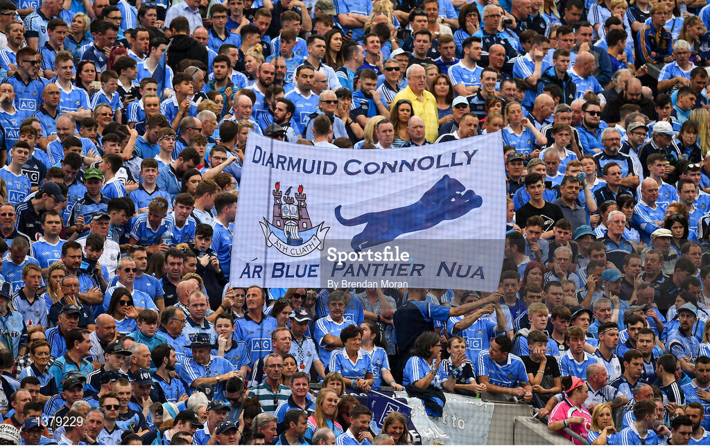 27 August 2017; Dublin fans on Hill 16 show their support for Diarmuid Connolly during the GAA Football All-Ireland Senior Championship Semi-Final match between Dublin and Tyrone at Croke Park in Dublin. Photo by Brendan Moran/Sportsfile
