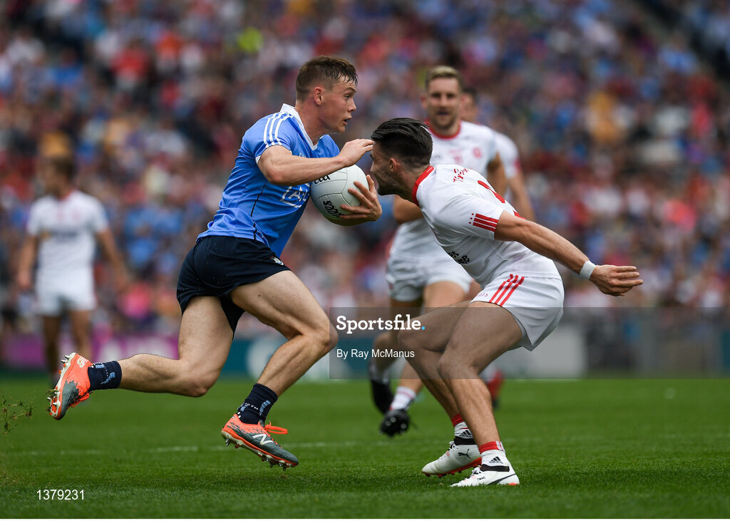 27 August 2017; Con O'Callaghan of Dublin in action against Tiernan McCann of Tyrone during the GAA Football All-Ireland Senior Championship Semi-Final match between Dublin and Tyrone at Croke Park in Dublin. Photo by Ray McManus/Sportsfile