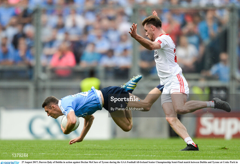 27 August 2017; Darren Daly of Dublin in action against Declan McClure of Tyrone during the GAA Football All-Ireland Senior Championship Semi-Final match between Dublin and Tyrone at Croke Park in Dublin. Photo by Piaras Ó Mídheach/Sportsfile