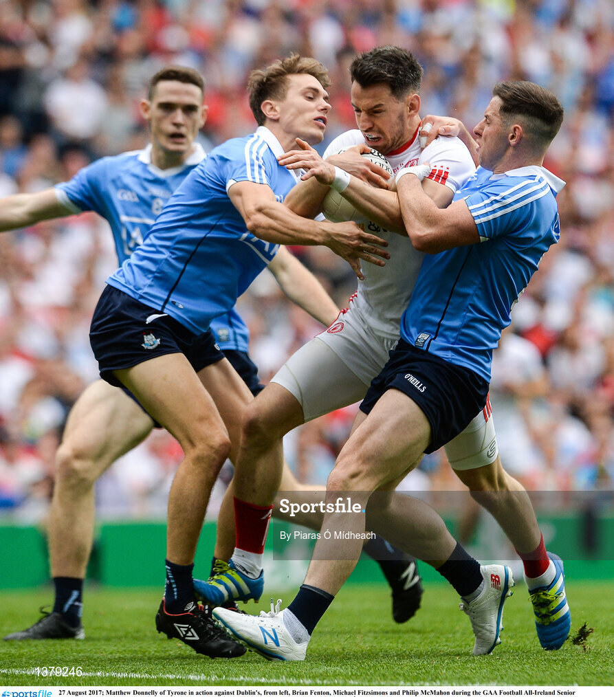 27 August 2017; Matthew Donnelly of Tyrone in action against Dublin's, from left, Brian Fenton, Michael Fitzsimons and Philip McMahon during the GAA Football All-Ireland Senior Championship Semi-Final match between Dublin and Tyrone at Croke Park in Dublin. Photo by Piaras Ó Mídheach/Sportsfile