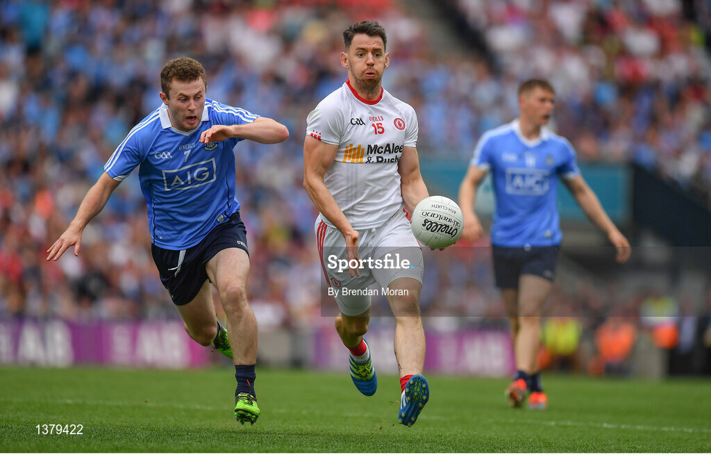 27 August 2017; Matthew Donnelly of Tyrone in action against Jack McCaffrey of Dublin during the Football All-Ireland Senior Championship Semi-Final match between Dublin and Tyrone at Croke Park in Dublin. Photo by Brendan Moran/Sportsfile