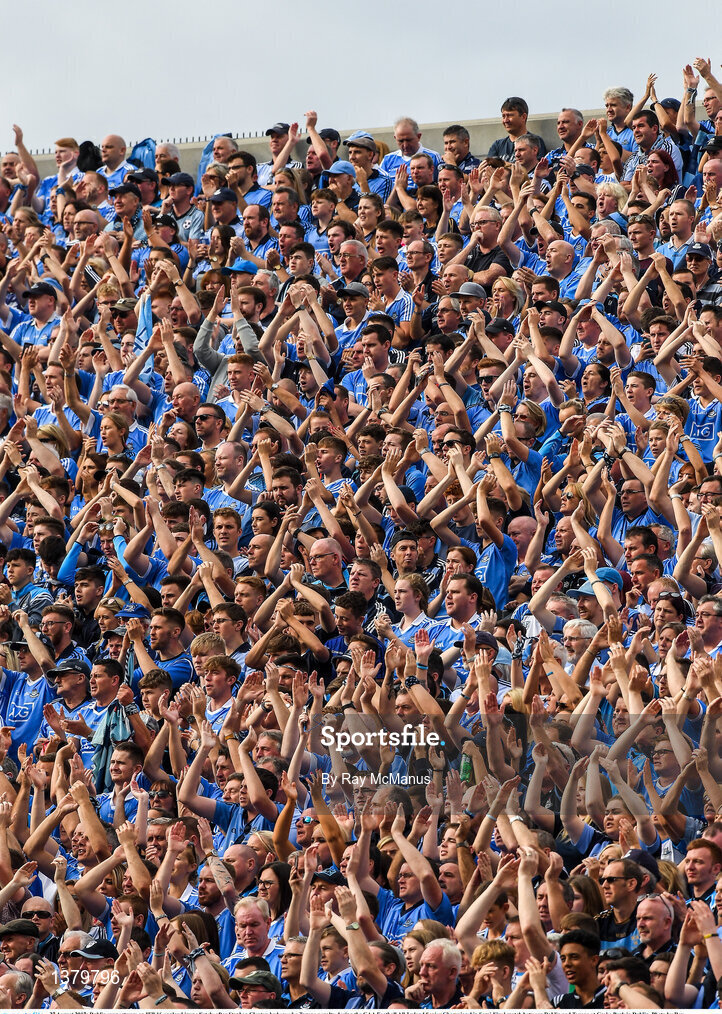 27 August 2017; Dublin supportewrs on Hill 16 applaud immediately after Stephen Cluxton had saved a Tyrone penalty during the GAA Football All-Ireland Senior Championship Semi-Final match between Dublin and Tyrone at Croke Park in Dublin. Photo by Ray McManus/Sportsfile