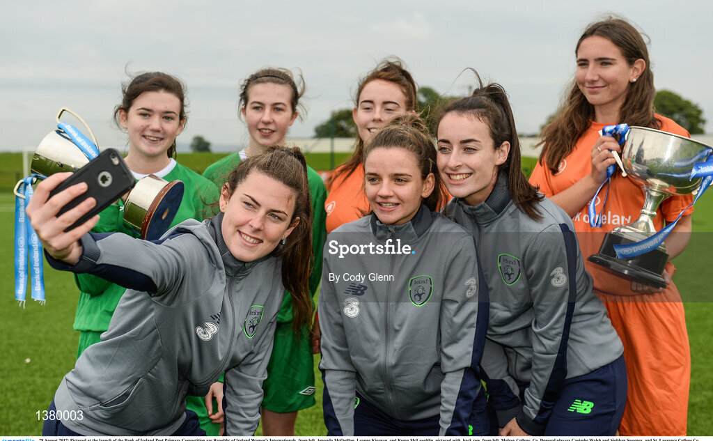 29 August 2017; Pictured at the launch of the Bank of Ireland Post Primary Competition are Republic of Ireland Women's Internationals, from left, Amanda McQuillan, Leanne Kiernan, and Roma McLaughlin, pictured with, back row, from left, Mulroy College, Co. Donegal players Caoimhe Walsh and Siobhan Sweeney, and St. Laurence College Co. Dublin players Clara Mulligan and Katie Doyle, at FAI Headquarters Abbotstown, Co Dublin. Photo by Cody Glenn/Sportsfile