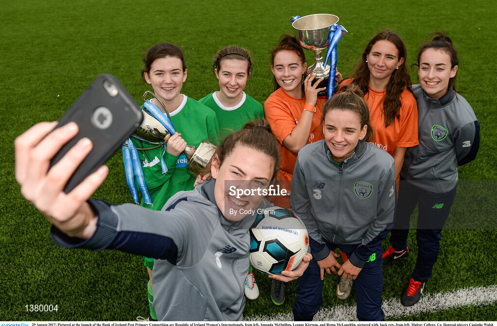 29 August 2017; Pictured at the launch of the Bank of Ireland Post Primary Competition are Republic of Ireland Women's Internationals, from left, Amanda McQuillan, Leanne Kiernan, and Roma McLaughlin, pictured with, back row, from left, Mulroy College, Co. Donegal players Caoimhe Walsh and Siobhan Sweeney, and St. Laurence College Co. Dublin players Clara Mulligan and Katie Doyle, at FAI Headquarters Abbotstown, Co Dublin. Photo by Cody Glenn/Sportsfile
