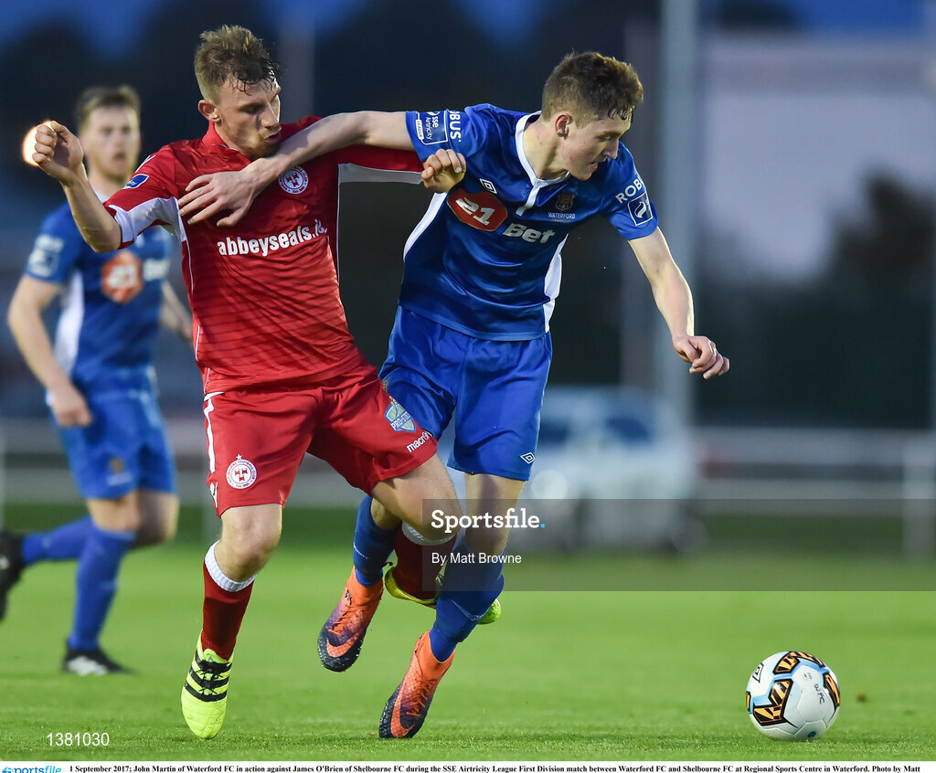 1 September 2017; John Martin of Waterford FC in action against James O'Brien of Shelbourne FC during the SSE Airtricity League First Division match between Waterford FC and Shelbourne FC at Regional Sports Centre in Waterford. Photo by Matt Browne/Sportsfile