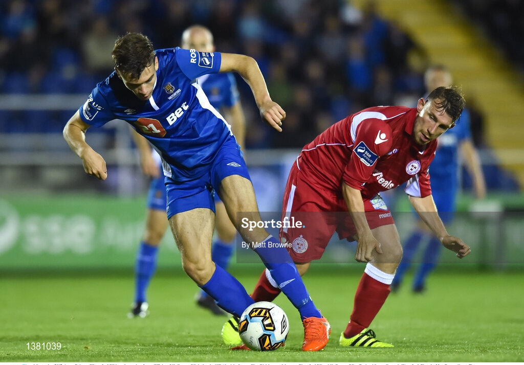 1 September 2017; Aaron Drinan of Waterford FC in action against James O'Brien of Shelbourne FC during the SSE Airtricity League First Division match between Waterford FC and Shelbourne FC at Regional Sports Centre in Waterford. Photo by Matt Browne/Sportsfile