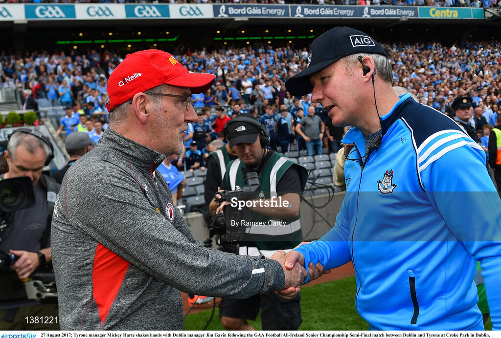 27 August 2017; Tyrone manager Mickey Harte shakes hands with Dublin manager Jim Gavin following the GAA Football All-Ireland Senior Championship Semi-Final match between Dublin and Tyrone at Croke Park in Dublin. Photo by Ramsey Cardy/Sportsfile