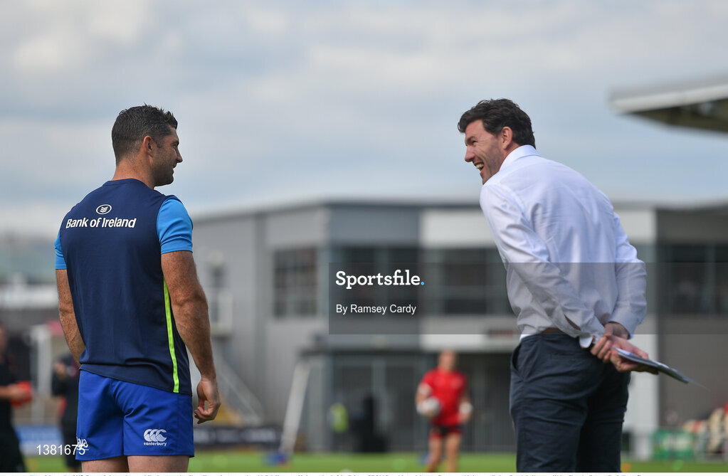 2 September 2017; Former Leinster player and Sky Sports analyst Shane Horgan in conversation with Rob Kearney of Leinster ahead of the Guinness PRO14 Round 1 match between Dragons and Leinster at Rodney Parade in Newport, Wales. Photo by Ramsey Cardy/Sportsfile
