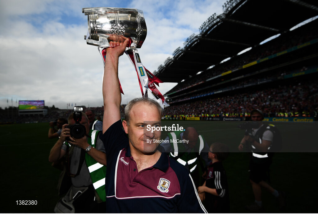 3 September 2017; Galway manager Micheál Donoghue celebrates with the Liam MacCarthy Cup following the GAA Hurling All-Ireland Senior Championship Final match between Galway and Waterford at Croke Park in Dublin. Photo by Stephen McCarthy/Sportsfile