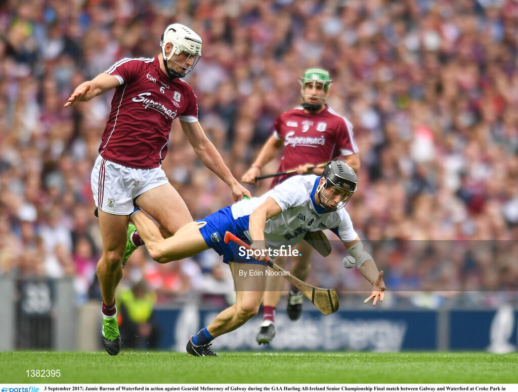3 September 2017; Jamie Barron of Waterford in action against Gearóid McInerney of Galway during the GAA Hurling All-Ireland Senior Championship Final match between Galway and Waterford at Croke Park in Dublin. Photo by Eóin Noonan/Sportsfile