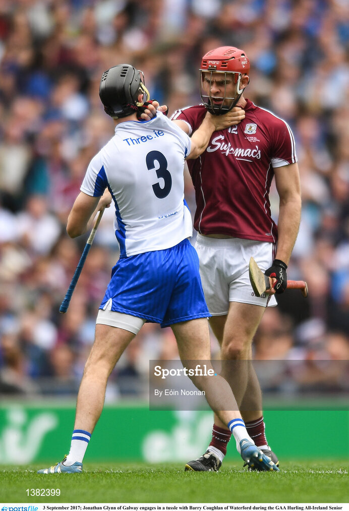 3 September 2017; Jonathan Glynn of Galway engages in a tussle with Barry Coughlan of Waterford during the GAA Hurling All-Ireland Senior Championship Final match between Galway and Waterford at Croke Park in Dublin. Photo by Eóin Noonan/Sportsfile