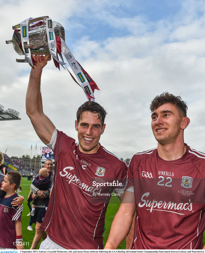 3 September 2017; Galway's Gearóid McInerney, left, and Jason Flynn celebrate following the GAA Hurling All-Ireland Senior Championship Final match between Galway and Waterford at Croke Park in Dublin. Photo by Ramsey Cardy/Sportsfile
