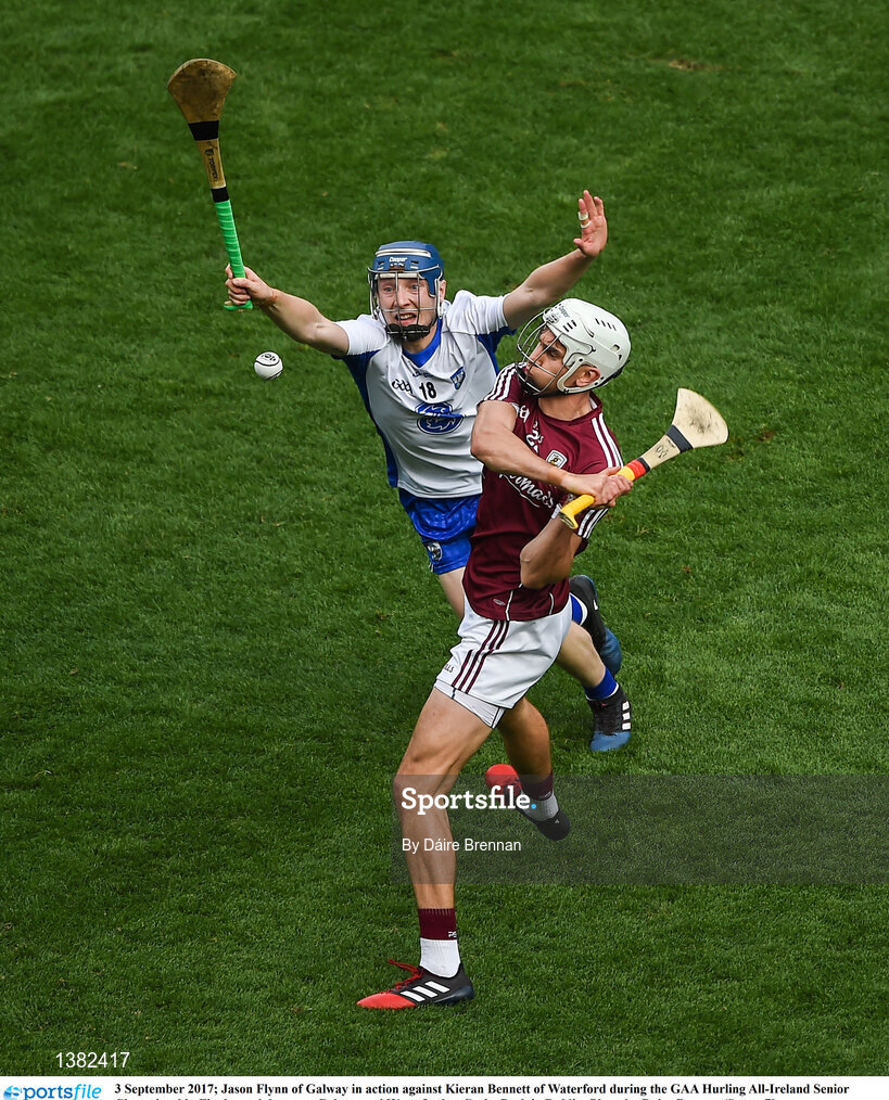 3 September 2017; Jason Flynn of Galway in action against Kieran Bennett of Waterford during the GAA Hurling All-Ireland Senior Championship Final match between Galway and Waterford at Croke Park in Dublin. Photo by Daire Brennan/Sportsfile