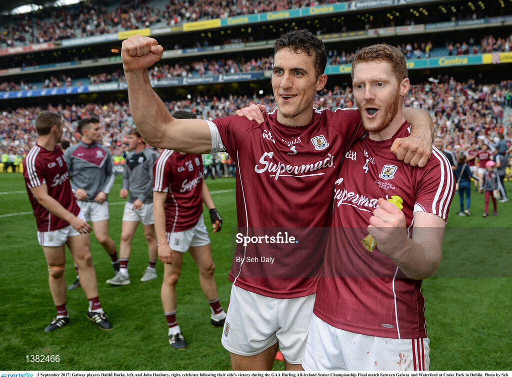 3 September 2017; Galway players DaithÌ Burke, left, and John Hanbury, right, celebrate following their side's victory during the GAA Hurling All-Ireland Senior Championship Final match between Galway and Waterford at Croke Park in Dublin. Photo by Seb Daly/Sportsfile