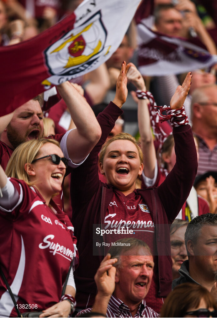 3 September 2017; Galway supporters, in the Cusack Stand, celebrate a score during the GAA Hurling All-Ireland Senior Championship Final match between Galway and Waterford at Croke Park in Dublin. Photo by Ray McManus/Sportsfile