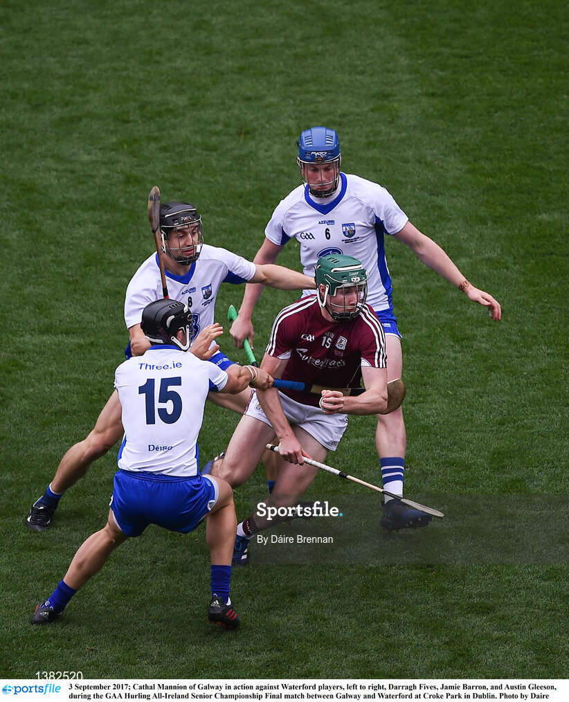 3 September 2017; Cathal Mannion of Galway in action against Waterford players, left to right, Darragh Fives, Jamie Barron, and Austin Gleeson, during the GAA Hurling All-Ireland Senior Championship Final match between Galway and Waterford at Croke Park in Dublin. Photo by Daire Brennan/Sportsfile