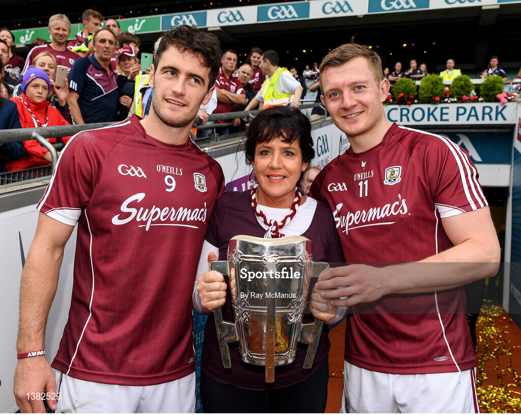 3 September 2017; Margaret Keady with the Liam MacCarthy Cup and Galway captain, David Burke , left, and Joe Canning after the GAA Hurling All-Ireland Senior Championship Final match between Galway and Waterford at Croke Park in Dublin. Photo by Ray McManus/Sportsfile