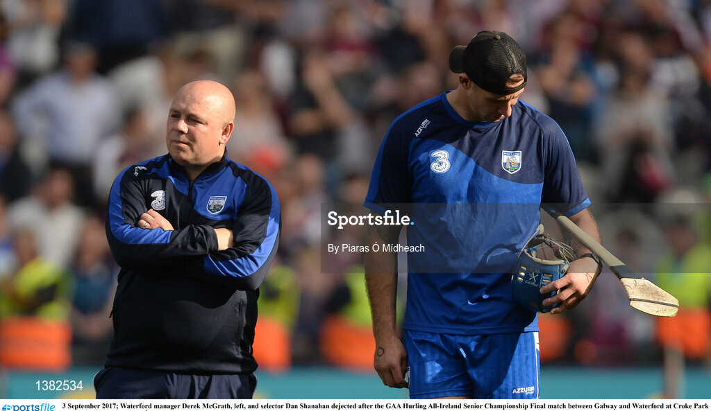 3 September 2017; Waterford manager Derek McGrath, left, and selector Dan Shanahan dejected after the GAA Hurling All-Ireland Senior Championship Final match between Galway and Waterford at Croke Park in Dublin. Photo by Piaras Ó Mídheach/Sportsfile