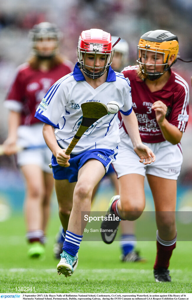 3 September 2017; Lily Hayes Nally of Ballintotas National School, Castlemarty, Co Cork, representing Waterford, in action against Ella Heary of St Marnocks National School, Portmarnock, Dublin, representing Galway, during the INTO Cumann na mBunscol GAA Respect Exhibition Go Games at Galway v Waterford - GAA Hurling All-Ireland Senior Championship Final at Croke Park in Dublin. Photo by Sam Barnes/Sportsfile