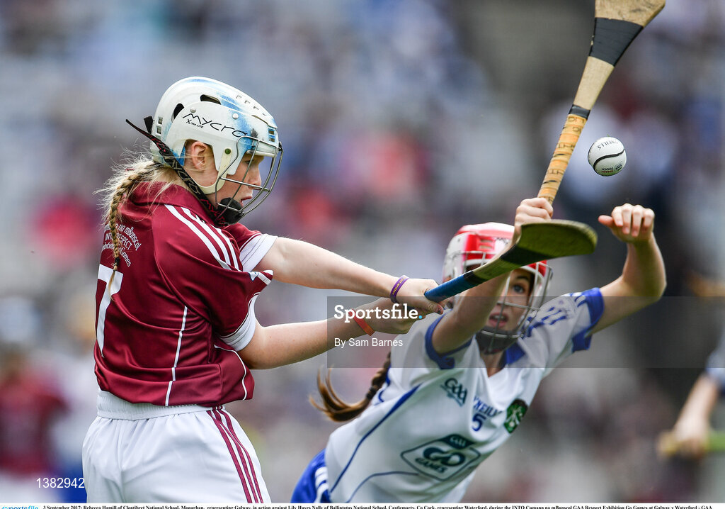 3 September 2017; Rebecca Hamill of Clontibret National School, Monaghan, representing Galway, in action against Lily Hayes Nally of Ballintotas National School, Castlemarty, Co Cork, representing Waterford, during the INTO Cumann na mBunscol GAA Respect Exhibition Go Games at Galway v Waterford - GAA Hurling All-Ireland Senior Championship Final at Croke Park in Dublin. Photo by Sam Barnes/Sportsfile
