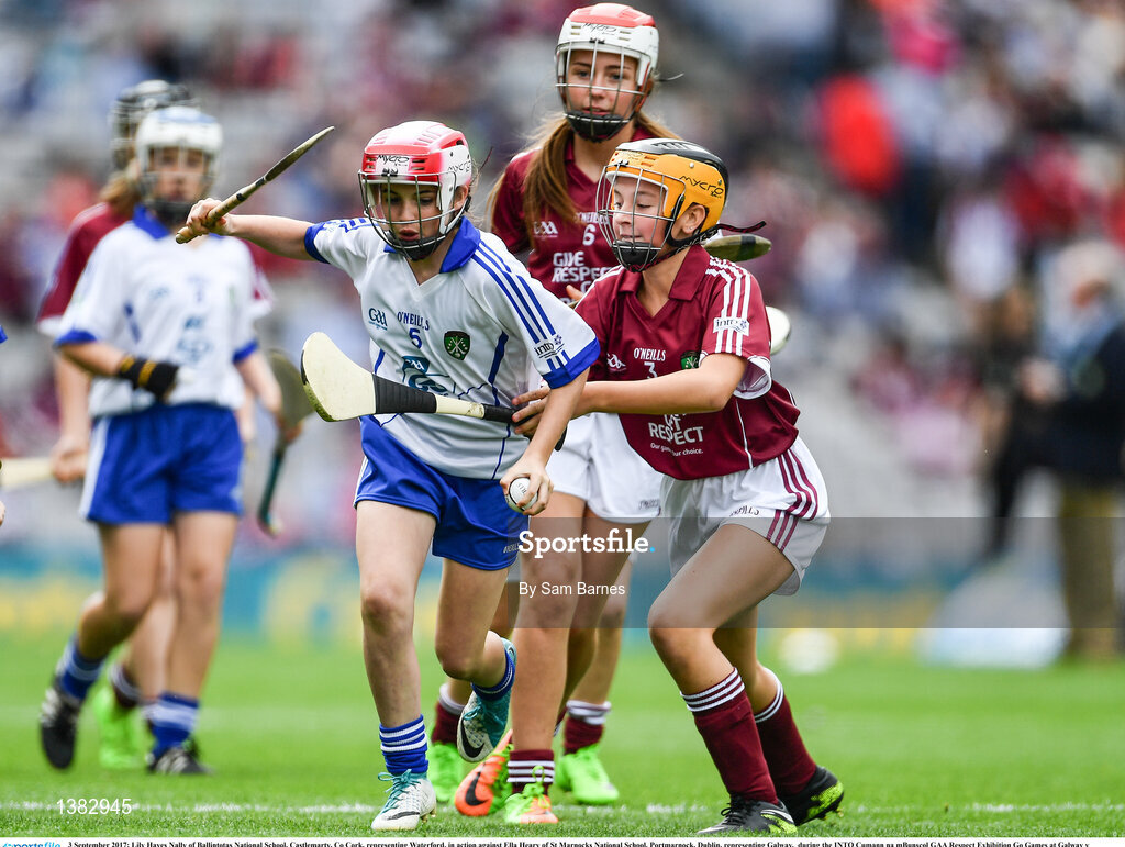 3 September 2017; Lily Hayes Nally of Ballintotas National School, Castlemarty, Co Cork, representing Waterford, in action against Ella Heary of St Marnocks National School, Portmarnock, Dublin, representing Galway, during the INTO Cumann na mBunscol GAA Respect Exhibition Go Games at Galway v Waterford - GAA Hurling All-Ireland Senior Championship Final at Croke Park in Dublin. Photo by Sam Barnes/Sportsfile