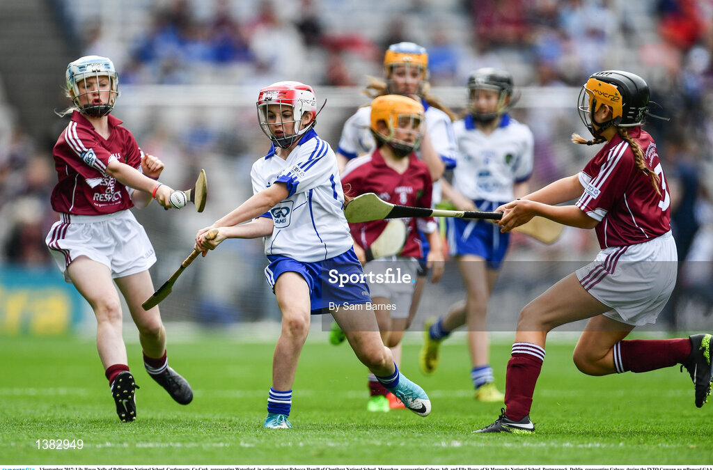 3 September 2017; Lily Hayes Nally of Ballintotas National School, Castlemarty, Co Cork, representing Waterford, in action against Rebecca Hamill of Clontibret National School, Monaghan, representing Galway, left, and Ella Heary of St Marnocks National School, Portmarnock, Dublin, representing Galway, during the INTO Cumann na mBunscol GAA Respect Exhibition Go Games at Galway v Waterford - GAA Hurling All-Ireland Senior Championship Final at Croke Park in Dublin. Photo by Sam Barnes/Sportsfile
