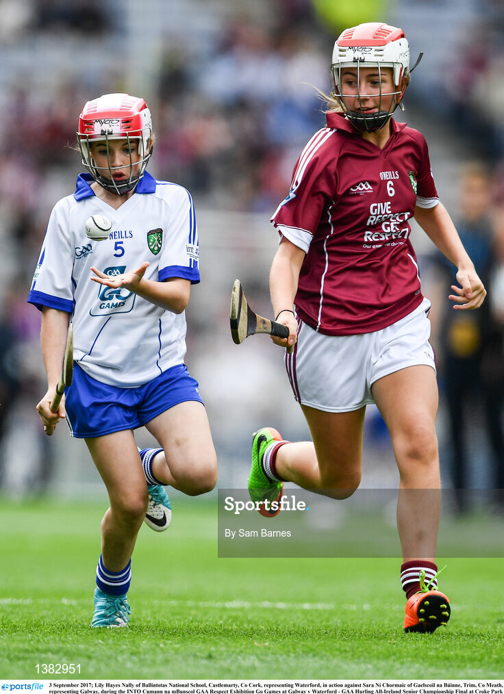 3 September 2017; Lily Hayes Nally of Ballintotas National School, Castlemarty, Co Cork, representing Waterford, in action against Sara Ní Chormaic of Gaelscoil na Búinne, Trim, Co Meath, representing Galway, during the INTO Cumann na mBunscol GAA Respect Exhibition Go Games at Galway v Waterford - GAA Hurling All-Ireland Senior Championship Final at Croke Park in Dublin. Photo by Sam Barnes/Sportsfile