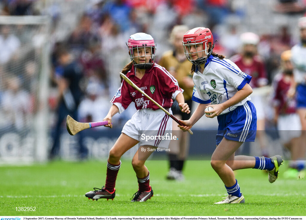 3 September 2017; Gemma Murray of Dromin National School, Dunleer, Co Louth, representing Waterford, in action against Alex Hodgins of Presentation Primary School, Terenure Road, Dublin, representing Galway, during the INTO Cumann na mBunscol GAA Respect Exhibition Go Games at Galway v Waterford - GAA Hurling All-Ireland Senior Championship Final at Croke Park in Dublin. Photo by Sam Barnes/Sportsfile