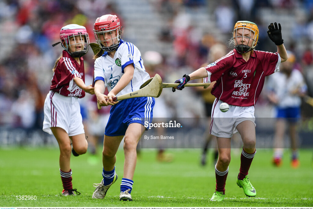 3 September 2017; Gemma Murray of Dromin National School, Dunleer, Co Louth, representing Waterford, in action against Laura Maguire of Scoil Chlann Naofa, Ballinamore, Co Leitrim, representing Galway, right, and Alex Hodgins of Presentation Primary School, Terenure Road, Dublin, representing Galway, during the INTO Cumann na mBunscol GAA Respect Exhibition Go Games at Galway v Waterford - GAA Hurling All-Ireland Senior Championship Final at Croke Park in Dublin. Photo by Sam Barnes/Sportsfile