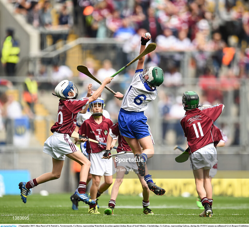 3 September 2017; Shea Pucci of St Patrick's, Newtownards, Co Down, representing Waterford, in action against Joshua Ryan of Scoil Mhuire, Clarinbridge, Co Galway, representing Galway, during the INTO Cumann na mBunscol GAA Respect Exhibition Go Games at Galway v Waterford - GAA Hurling All-Ireland Senior Championship Final at Croke Park in Dublin. Photo by Seb Daly/Sportsfile