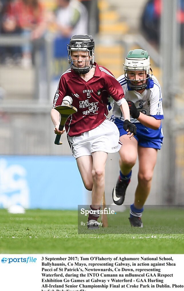 3 September 2017; Tom O'Flaherty of Aghamore National School, Ballyhaunis, Co Mayo, representing Galway, in action against Shea Pucci of St Patrick's, Newtownards, Co Down, representing Waterford, during the INTO Cumann na mBunscol GAA Respect Exhibition Go Games at Galway v Waterford - GAA Hurling All-Ireland Senior Championship Final at Croke Park in Dublin. Photo by Seb Daly/Sportsfile