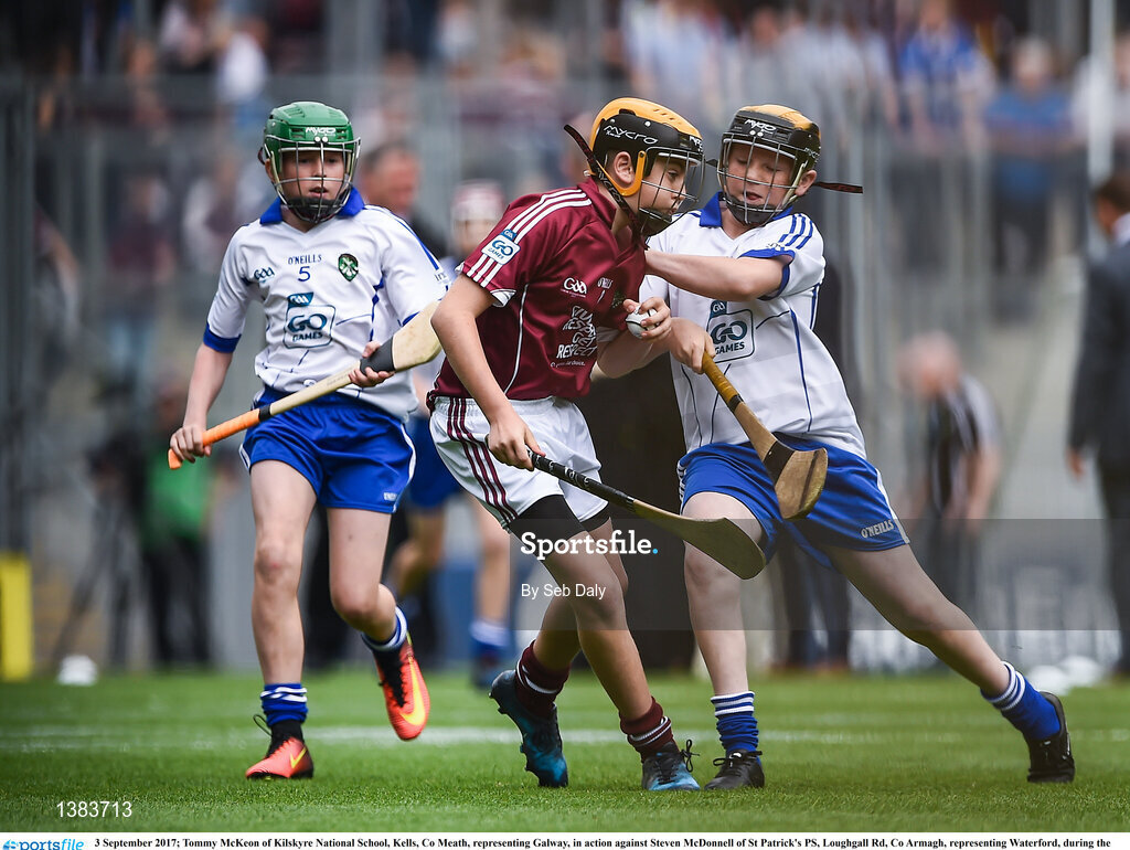 3 September 2017; Tommy McKeon of Kilskyre National School, Kells, Co Meath, representing Galway, in action against Steven McDonnell of St Patrick's PS, Loughgall Rd, Co Armagh, representing Waterford, during the INTO Cumann na mBunscol GAA Respect Exhibition Go Games at Galway v Waterford - GAA Hurling All-Ireland Senior Championship Final at Croke Park in Dublin. Photo by Seb Daly/Sportsfile
