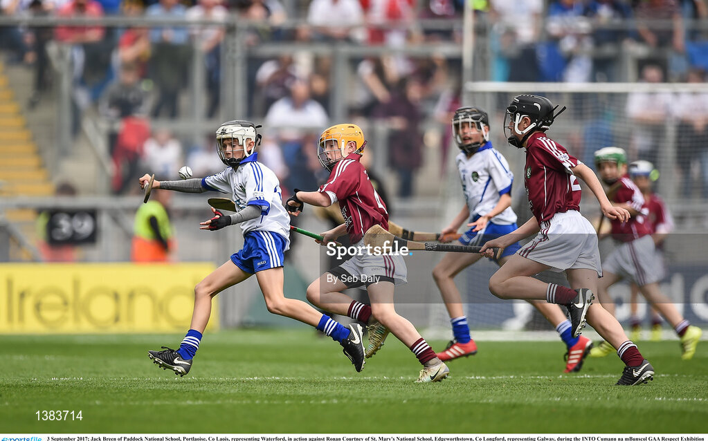 3 September 2017; Jack Breen of Paddock National School, Portlaoise, Co Laois, representing Waterford, in action against Ronan Courtney of St. Mary's National School, Edgeworthstown, Co Longford, representing Galway, during the INTO Cumann na mBunscol GAA Respect Exhibition Go Games at Galway v Waterford - GAA Hurling All-Ireland Senior Championship Final at Croke Park in Dublin. Photo by Seb Daly/Sportsfile