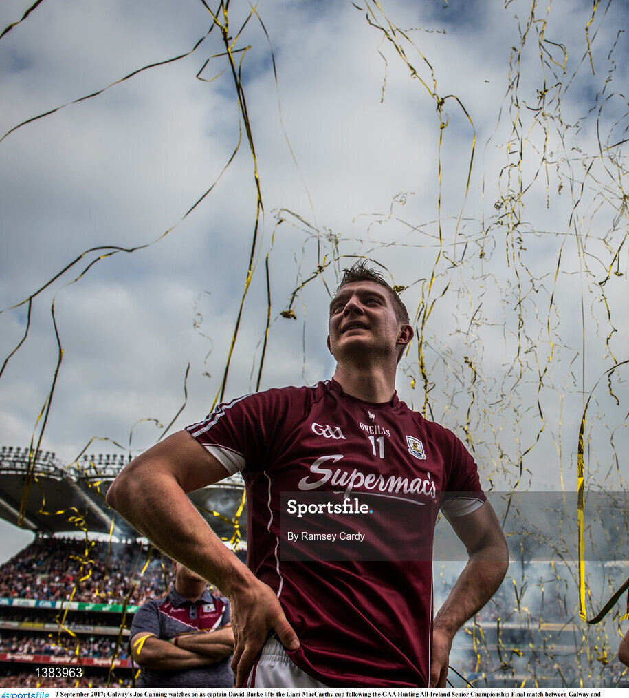 3 September 2017; Galway's Joe Canning watches on as captain David Burke lifts the Liam MacCarthy cup following the GAA Hurling All-Ireland Senior Championship Final match between Galway and Waterford at Croke Park in Dublin. Photo by Ramsey Cardy/Sportsfile