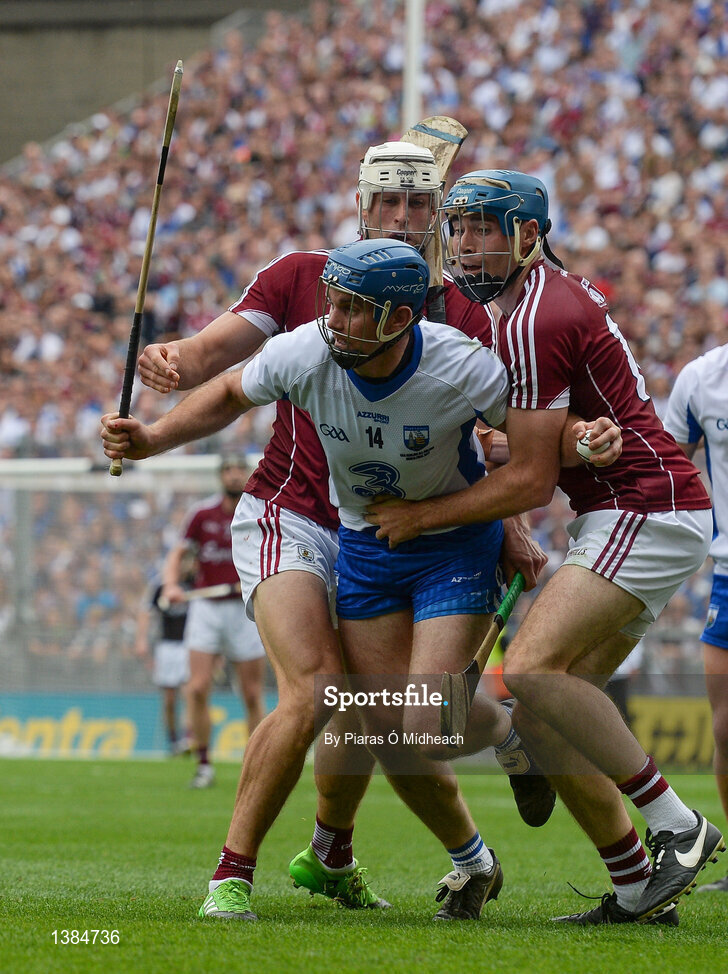 3 September 2017; Michael Walsh of Waterford in action against Gearóid McInerney, left, and Conor Cooney of Galway during the GAA Hurling All-Ireland Senior Championship Final match between Galway and Waterford at Croke Park in Dublin. Photo by Piaras Ó Mídheach/Sportsfile