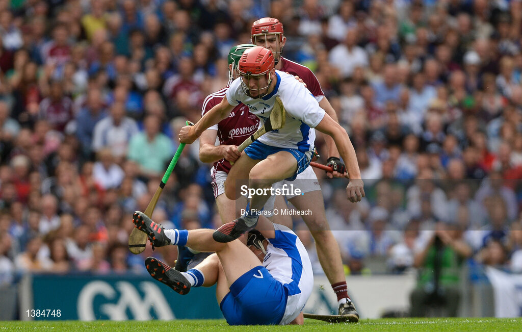 3 September 2017; Tadhg de Búrca of Waterford jumps over team-mate Philip Mahony as he gets away from Cathal Mannion and Jonathan Glynn of Galway during the GAA Hurling All-Ireland Senior Championship Final match between Galway and Waterford at Croke Park in Dublin. Photo by Piaras Ó Mídheach/Sportsfile