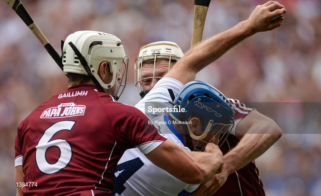 3 September 2017; Michael Walsh of Waterford is tackled by Gearóid McInerney, left, and Joe Canning of Galway during the GAA Hurling All-Ireland Senior Championship Final match between Galway and Waterford at Croke Park in Dublin. Photo by Piaras Ó Mídheach/Sportsfile