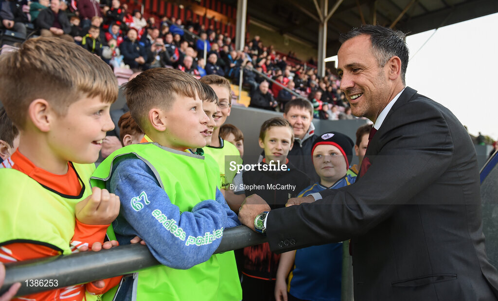 9 September 2017; Longford Town manager Neale Fenn with young supporters prior to the Irish Daily Mail FAI Cup Quarter-Final match between Longford Town and Cork City at The City Calling Stadium in Longford. Photo by Stephen McCarthy/Sportsfile