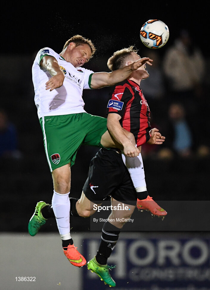 9 September 2017; Achille Campion of Cork City in action against Daniel O'Reilly of Longford Town during the Irish Daily Mail FAI Cup Quarter-Final match between Longford Town and Cork City at The City Calling Stadium in Longford. Photo by Stephen McCarthy/Sportsfile