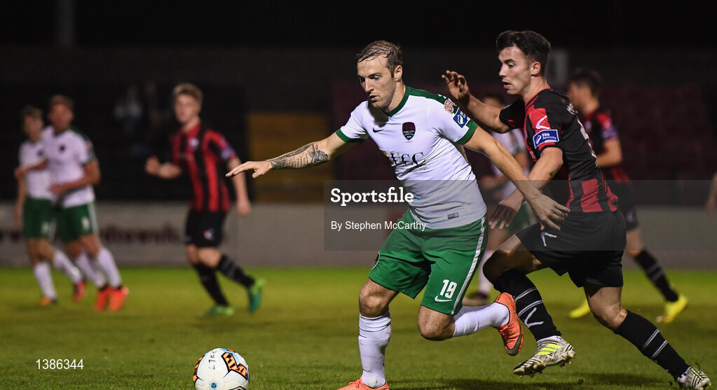 9 September 2017; Karl Sheppard of Cork City in action against Karl Chambers of Longford Town during the Irish Daily Mail FAI Cup Quarter-Final match between Longford Town and Cork City at The City Calling Stadium in Longford. Photo by Stephen McCarthy/Sportsfile