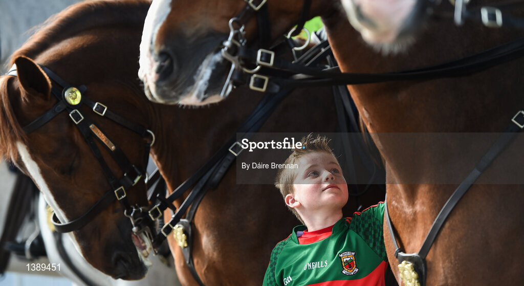 17 September 2017; Mayo supporter Brían Cullinane, aged 9, from Claremorris, Co Mayo, with the An Garda Síochána horses on Jones' Road ahead of the GAA Football All-Ireland Senior Championship Final match between Dublin and Mayo at Croke Park in Dublin. Photo by Daire Brennan/Sportsfile