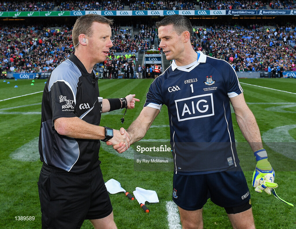 17 September 2017; Stephen Cluxton of Dublin shakes hands with Referee Joe McQuillan prior to the GAA Football All-Ireland Senior Championship Final match between Dublin and Mayo at Croke Park in Dublin. Photo by Ray McManus/Sportsfile
