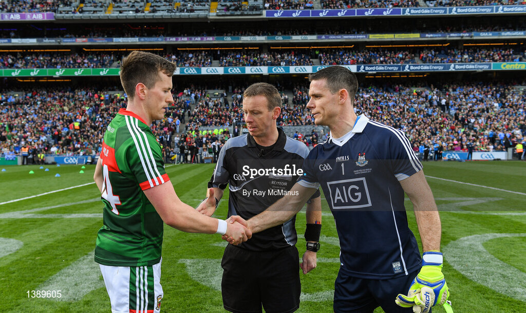 17 September 2017; Mayo captain Cillian O'Connor shakes hands with Dublin captain Stephen Cluxton ahead of the GAA Football All-Ireland Senior Championship Final match between Dublin and Mayo at Croke Park in Dublin.