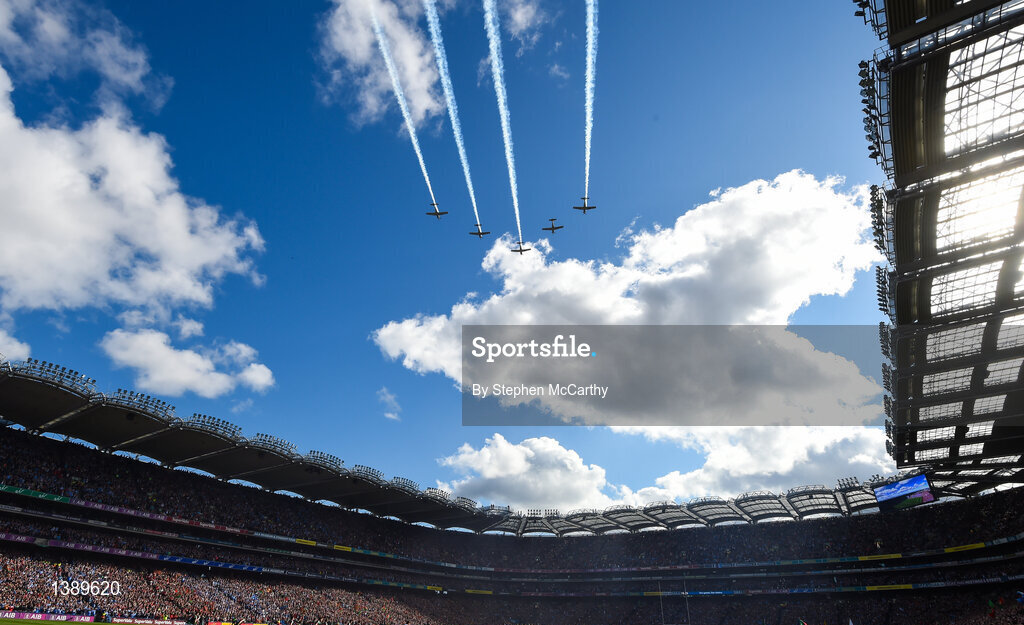 17 September 2017; A general view of the Irish Airforce making their way over the stadium prior to the GAA Football All-Ireland Senior Championship Final match between Dublin and Mayo at Croke Park in Dublin. Photo by Stephen McCarthy/Sportsfile
