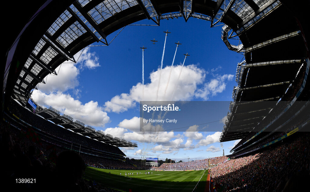 17 September 2017; A general view of the Irish Airforce making their way over the stadium prior to the GAA Football All-Ireland Senior Championship Final match between Dublin and Mayo at Croke Park in Dublin Photo by Ramsey Cardy/Sportsfile