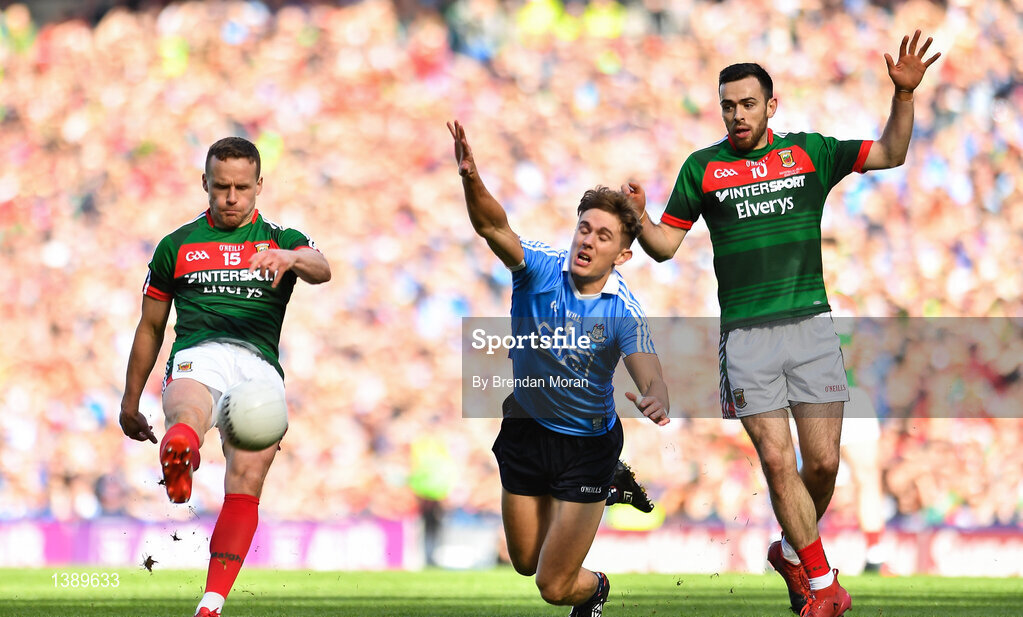 17 September 2017; Andy Moran of Mayo scores a point despite the efforts of Michael Fitzsimons of Dublin during the GAA Football All-Ireland Senior Championship Final match between Dublin and Mayo at Croke Park in Dublin. Photo by Brendan Moran/Sportsfile