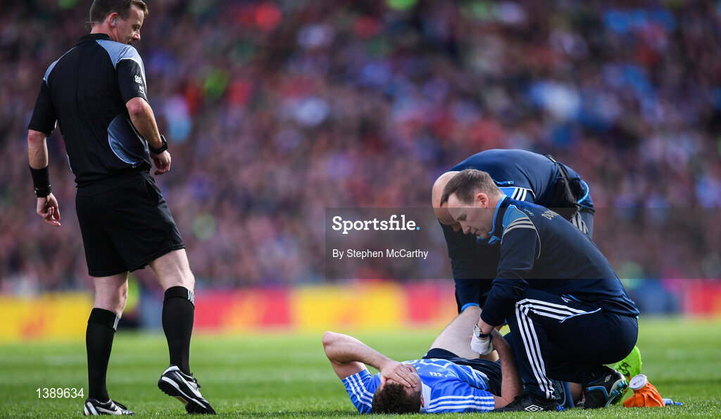 17 September 2017; Jack McCaffrey of Dublin reacts after picking up an injury during the GAA Football All-Ireland Senior Championship Final match between Dublin and Mayo at Croke Park in Dublin. Photo by Stephen McCarthy/Sportsfile