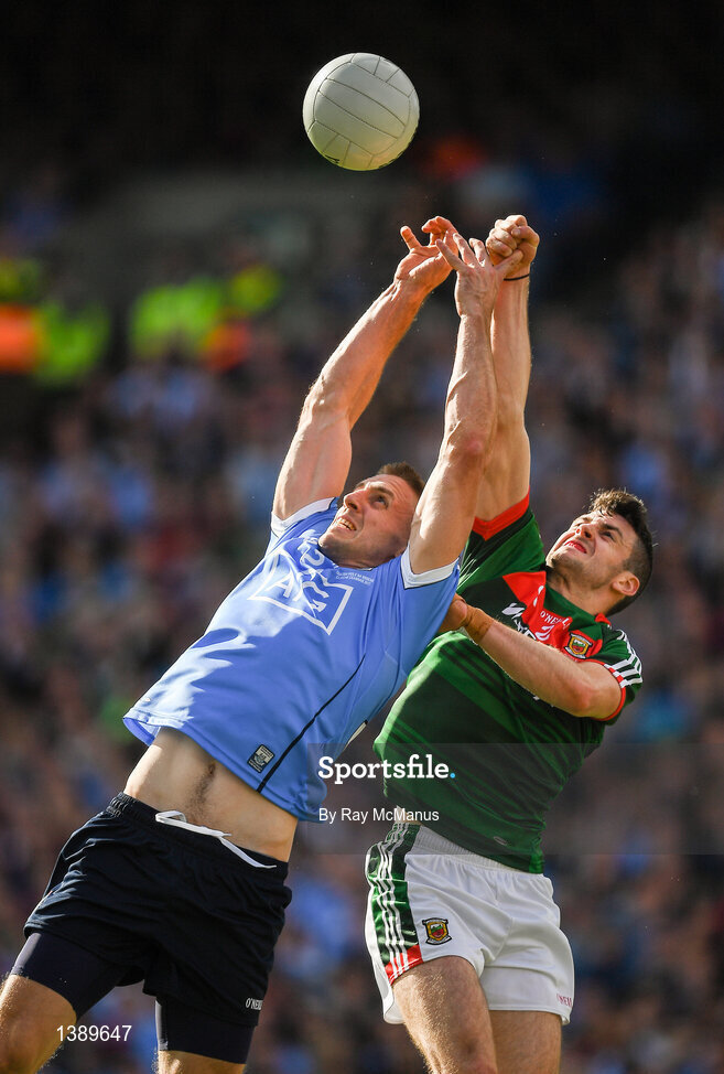 17 September 2017; Eoghan O'Gara of Dublin in action against Brendan Harrison of Mayo during the GAA Football All-Ireland Senior Championship Final match between Dublin and Mayo at Croke Park in Dublin.