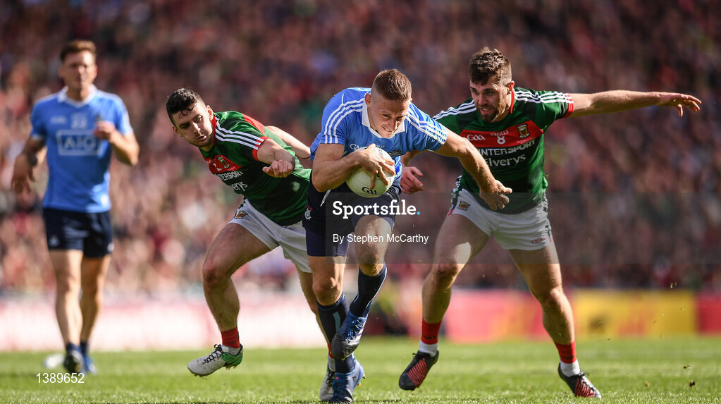 17 September 2017; Eoghan O'Gara of Dublin in action against Chris Barrett, left, and Séamus O'Shea of Mayo during the GAA Football All-Ireland Senior Championship Final match between Dublin and Mayo at Croke Park in Dublin. Photo by Stephen McCarthy/Sportsfile
