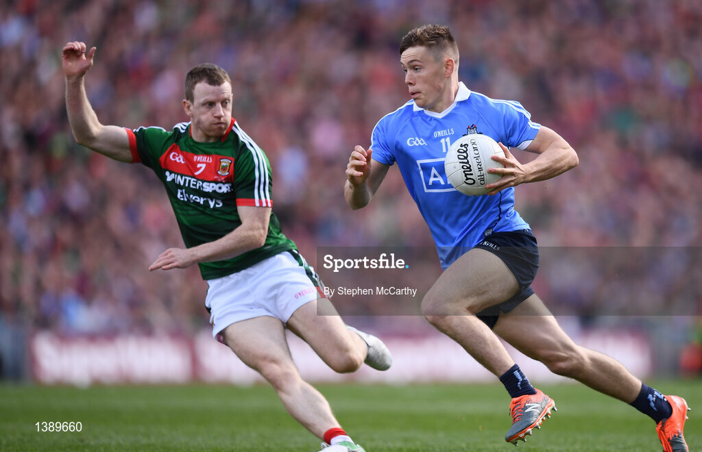 17 September 2017; Con O'Callaghan of Dublin escapes the attention of Colm Boyle of Mayo on his way to scoring his side's first goal during the GAA Football All-Ireland Senior Championship Final match between Dublin and Mayo at Croke Park in Dublin. Photo by Stephen McCarthy/Sportsfile